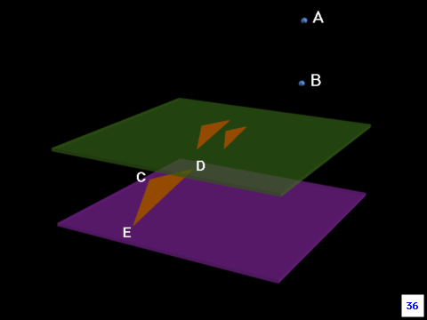 Le due figure piane triangolari, ottenute a seguito delle proiezioni sul piano beta, sono figure corrispondenti in un rapporto omologico; individuiamo il centro dell'omologia O all'intersezione della retta che unisce i due punti di proiezione con il quadro.